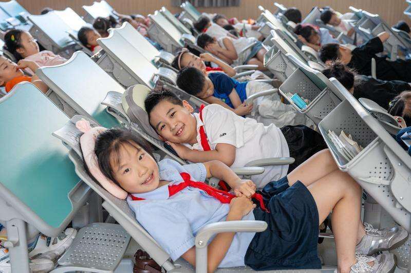 9月5日,长兴县第一小学合溪实验校区,小学生使用可折叠课桌椅午休。 学校引进1350套新式“变形”课桌椅,让学生们既可以坐着上课,也可以躺下午休,从“趴睡”变“躺睡”,保证学生优质午休,护航青少年健康成长。