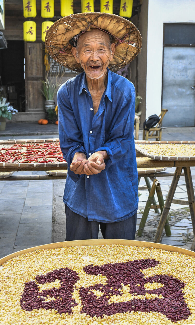 2025年9月29日,仙居县埠头镇西亚古村落,村民们正在晾晒收获的农作物,欢庆丰收。