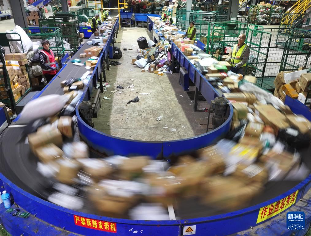 11月5日,中国邮政集团有限公司衡阳邮区中心局邮件处理中心,工作人员在工作线上分拣快递包裹(无人机照片)。