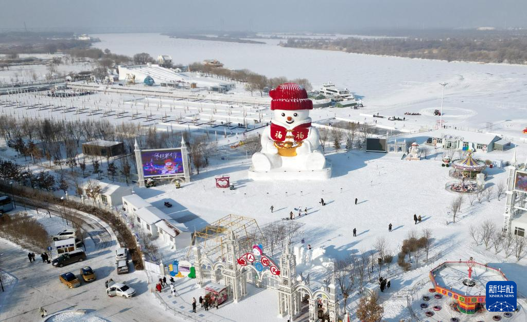 12月24日在哈尔滨外滩德嘉雪人码头冰雪景区拍摄的大雪人(无人机照片)。