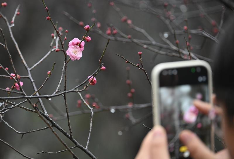 1月17日,杭州西溪湿地,游客在雨中探梅。 眼下的西溪,正是蜡梅与梅花交香的“梅”好时节。金钟、狗牙等蜡梅正值盛放,江梅、宫粉等品种零星初开,嫩蕊点缀疏枝,暗香浮动。 预计1月底至3月,绿萼、朱砂、美人梅等将陆续盛放。届时,景区内300亩梅林、2万余株梅树将形成“香雪海”景观,梅竹休闲区至深潭口沿线更可泛舟探梅,全程约12公里。