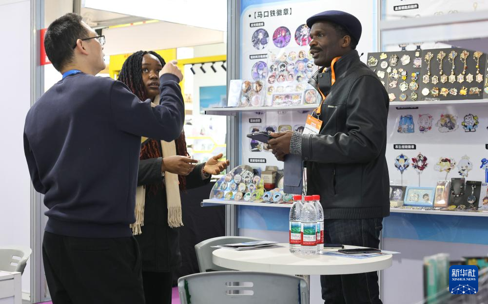 3月1日,一名采购商(右)在了解产品信息。