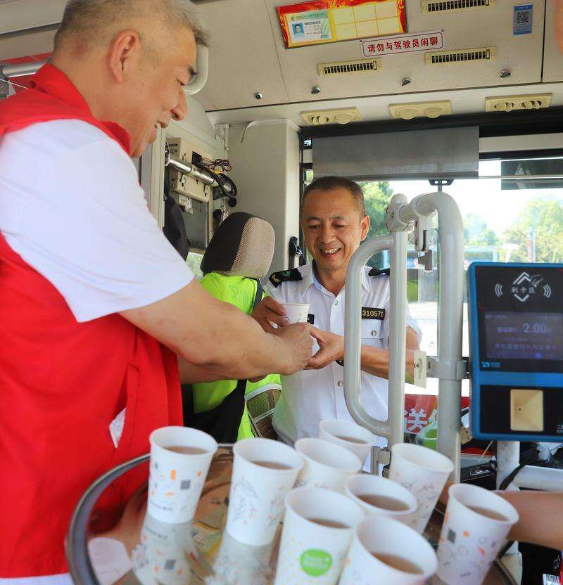 8月9日,台州市路桥区的慈善义工和党员志愿者在当地人流量较大的中国日用品商城设摊,为过往群众、公交司机、环卫工人、巡逻民警等送上亲手熬制的凉茶,在这酷暑天里给人们送去丝丝凉意。