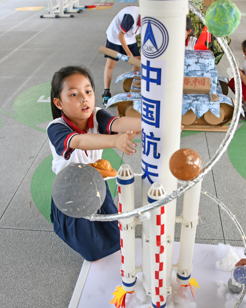 9月29日,华东师范大学附属仙居学校举行“学习航天知识 点亮航天梦想”为主题的迎国庆活动,学生们以废旧纸板、塑料瓶等环保材料为原料,在老师和家长指导下制作出火箭、空间站等模型,激发热爱科学、探索宇宙、勇于创新的热情。