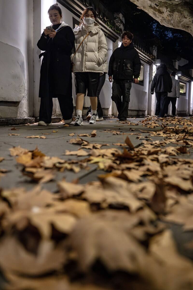 11月17日傍晚,杭州西湖畔,游人裹紧衣服走在满地落叶的北山街上。当天下午,杭州市气象台宣布,杭城于18日正式入冬。