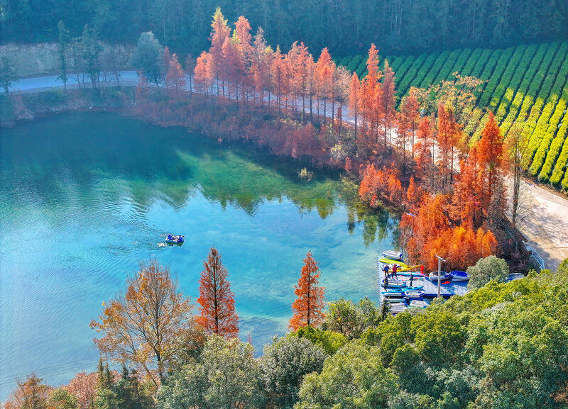 近日,浙江省湖州市长兴县龙山街道桃花岕森林公园层林尽染,碧绿的湖水镶嵌在色彩斑斓的群山之间,与茶山、水杉、道路相映成景,构成一幅壮美的生态画卷。众多市民在公园内观光游玩,尽享冬日美景。