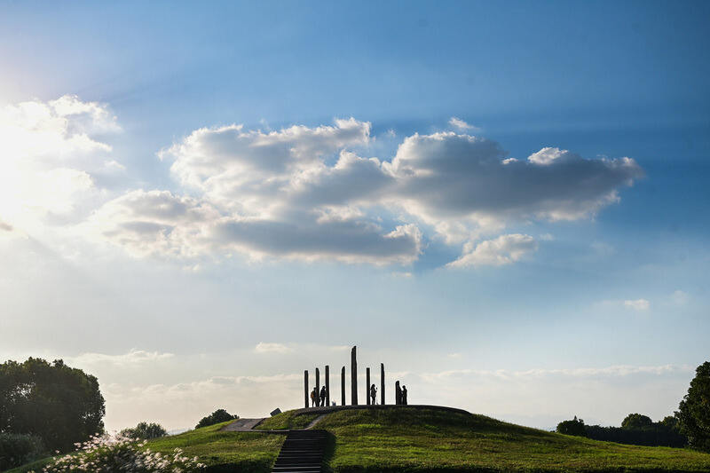 ​10月24日,良渚古城遗址公园里,游客在蓝天白云下享受秋色。市气象台预报,杭城未来一周以秋高气爽天气为主,气温略有回升,但早晚气温较低,体感较凉。