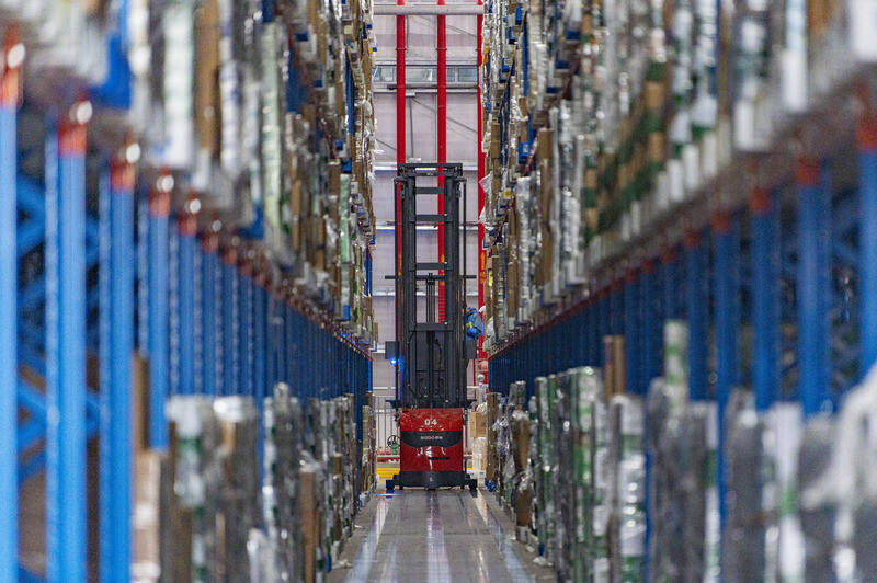 11月4日,浙江省金华市浦江智慧物流产业园里,工人驾驶车辆在货架上自动化分拣货物,一派繁忙景象。