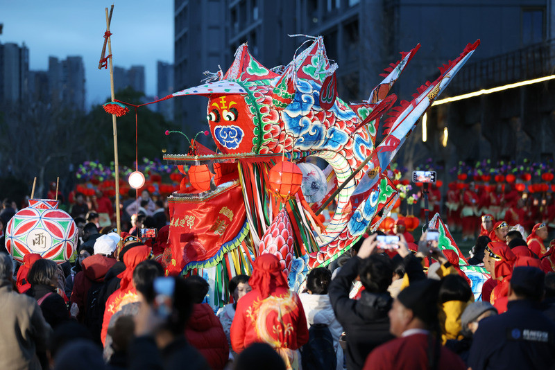 3月2日,正月十四,杭州武林之星博览中心举行“来武林之星闹元宵”主题游园会。来自磐安的省级非物质文化遗产“岭口亭阁花灯”在园区内蜿蜒巡游。