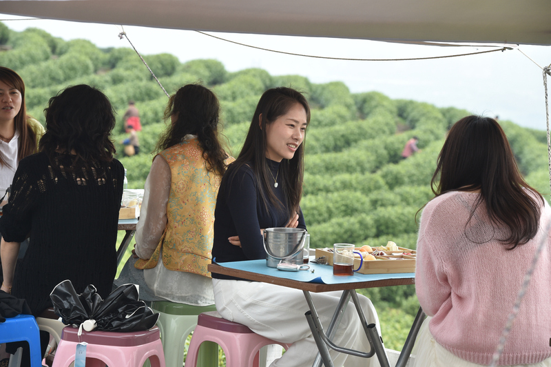 4月2日,观光品茶的游客沿着公路一字排开,春风拂面,眼前是长兴县龙山街道渚山村满目青翠的茶园。 只要1元即可落座,畅享无限续杯。