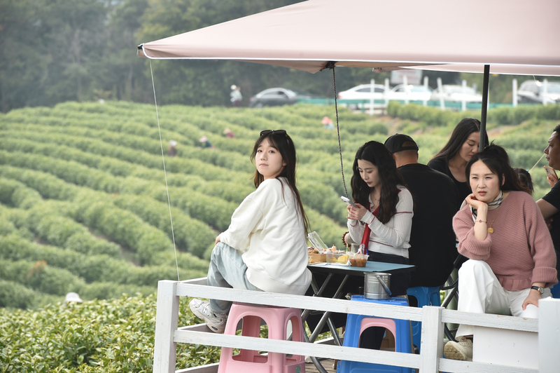 4月2日,观光品茶的游客沿着公路一字排开,春风拂面,眼前是长兴县龙山街道渚山村满目青翠的茶园。 只要1元即可落座,畅享无限续杯。