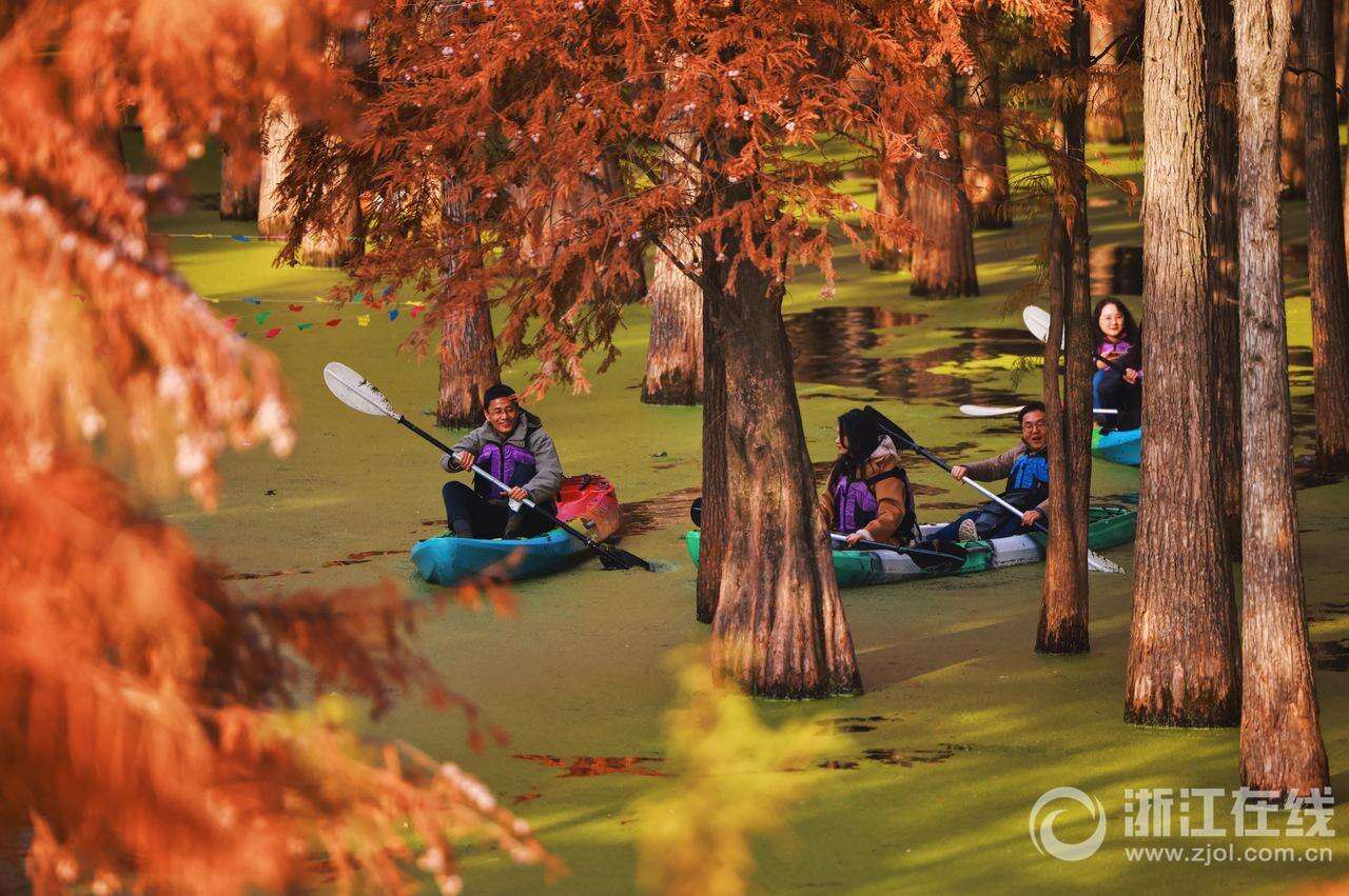 12月4日,在杭州临安区青山湖,水上森林悄然换装,红、黄、橙交织,如天然调色盘。游客纷纷来此感受宁静而热烈的生态诗意。