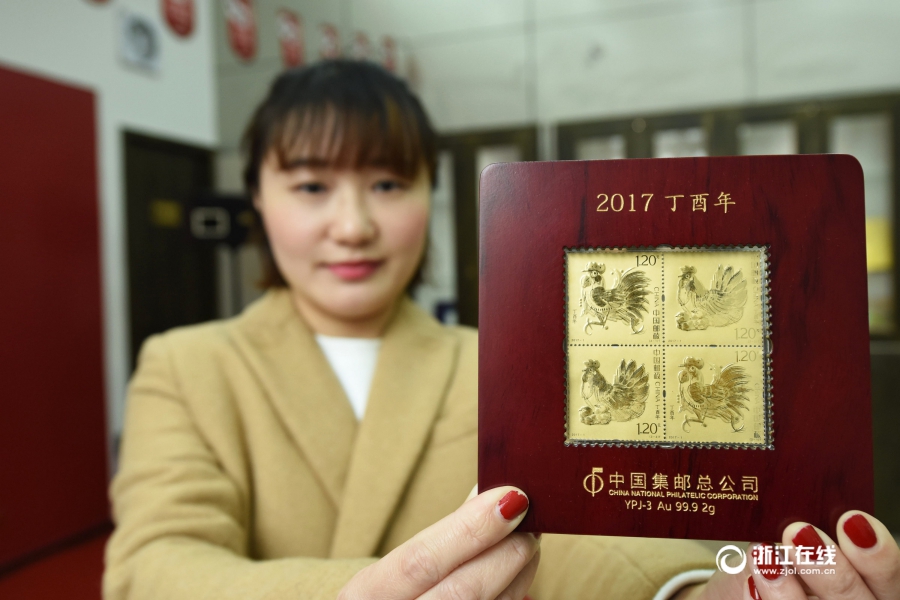 1月3日,杭州邮票公司的工作人员在展示中国集邮总公司限量发行的《丁酉年》生肖邮票金砖。中国邮政将于2017年1月5日发行《丁酉年》生肖邮票,邮票一套2枚,面值2.4元。