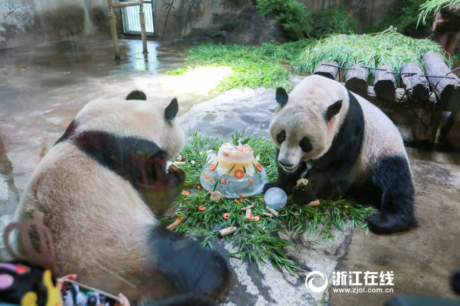 浙江在线7月15日讯(浙江在线记者 张迪 董旭明 摄)7月14日一大早,杭州动物园的工作人员就为熊猫馆馆主成就、双好的3岁“生日趴”忙活开了。“成就双好都是2014年7月出生的,所以我们就找了周五,7月14日,给哥俩过生日。”选择这个日子,另一个特别的原因是,在熊猫馆干了38年的老保育员张旭升要退休了。“在我们动物园里,他是专职饲养大熊猫时间最久的一位保育员。”杭州动物园的工作人员说。