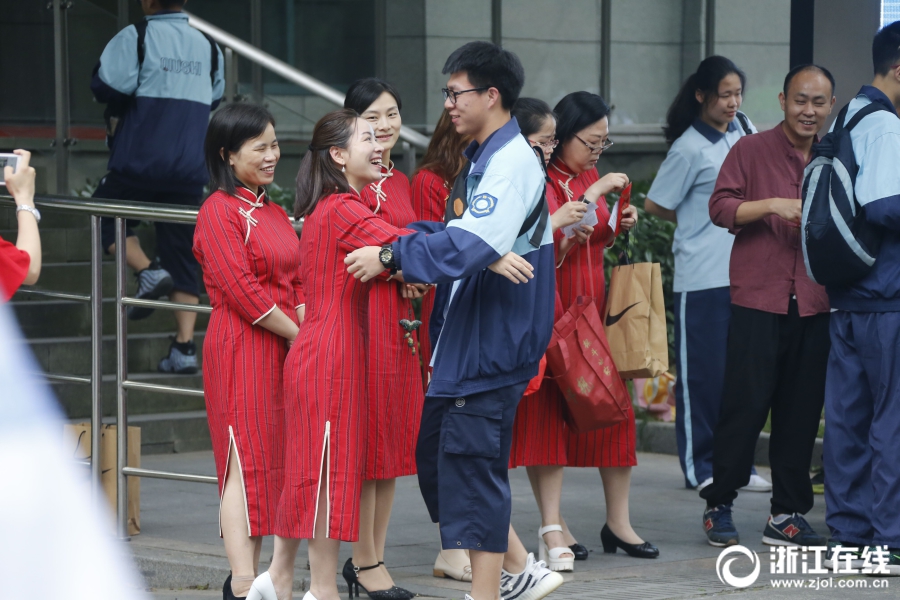 浙江在线6月7日讯(浙江在线记者 吴煌 倪雁强 王建龙 拍友 奕婷婷 摄)6月7日,万众瞩目的2018高考拉开帷幕。杭州各中学考点前,老师身着红色旗袍给考生加油鼓劲,考生家长与考生们击掌拥抱。据悉,今年浙江省共约30.6万考生,比2017年首次新高考增加1.5万余人。