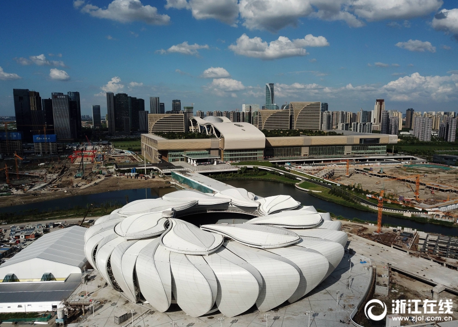 浙江在线8月29日讯(浙江在线记者 董旭明 摄)8月28日,距离12月3日在杭州举办的“第14届国际泳联世界短池游泳锦标赛”还有104天。作为本次国际大赛的主场馆,正在建设中的杭州奥体网球中心(小莲花)也已进入室内装修、设备安装及馆外配套设施等项目的施工冲刺阶段,按计划将在9月底完工,交付验收和调试运行。