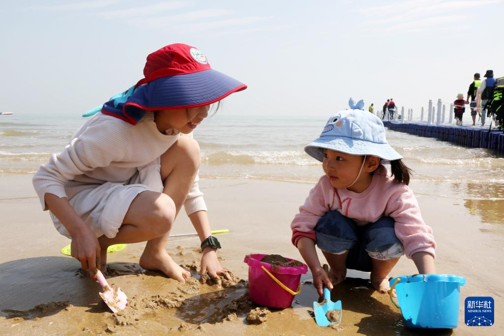 4月6日,小朋友在江苏省连云港海滨的沙滩上挖沙子。