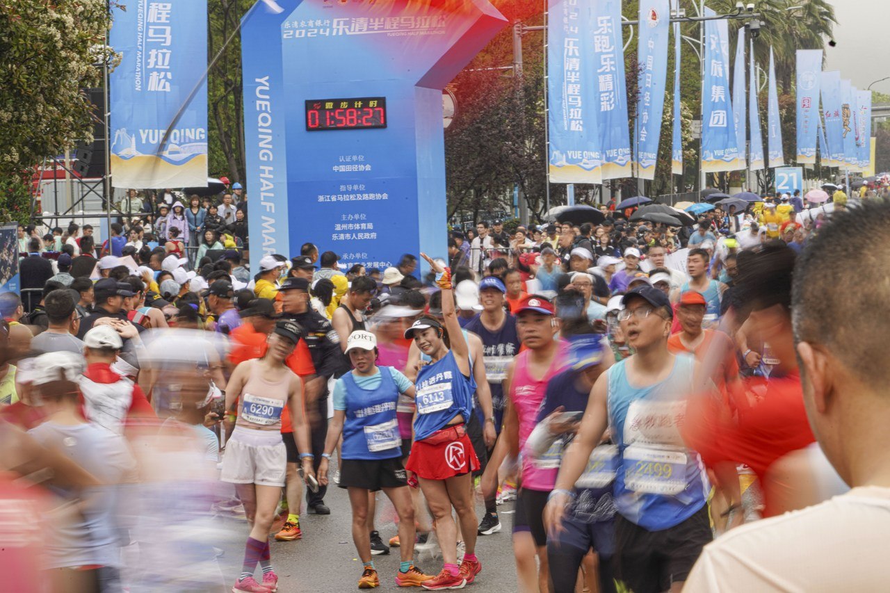 4月14日,在浙江省温州市乐清体育中心,选手们纷纷跑出起跑线。当日,温州市乐清半程马拉松赛鸣枪起跑,5000名选手参赛在绵绵烟雨中同场竞技,体验奔跑的魅力。