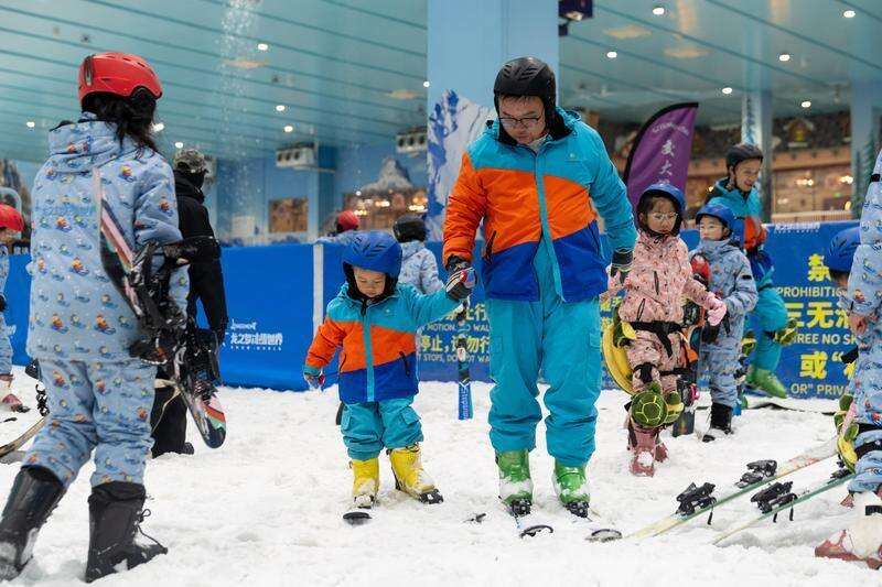 2025年8月6日,浙江省湖州市长兴县太湖龙之梦乐园冰雪世界室内滑雪场,家长正带着孩子来体验滑雪。