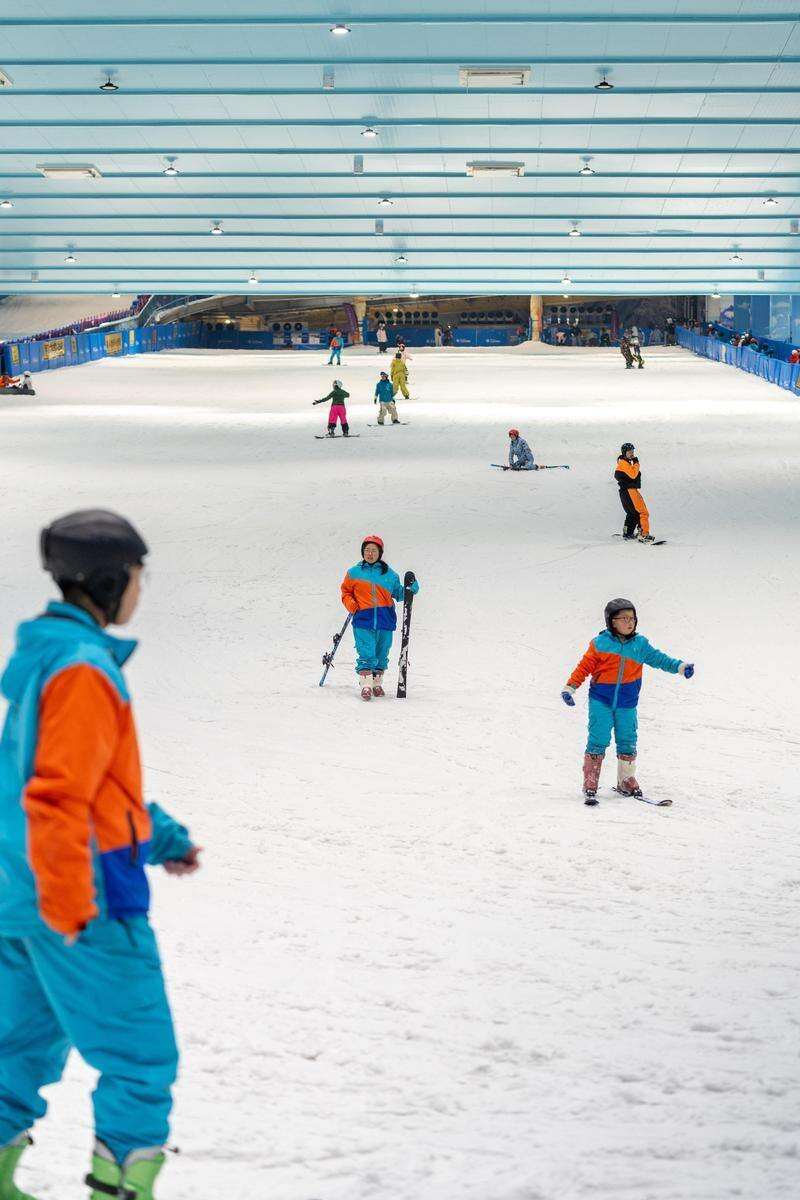 2025年8月6日,浙江省湖州市长兴县太湖龙之梦乐园冰雪世界室内滑雪场,游客们正在滑雪。