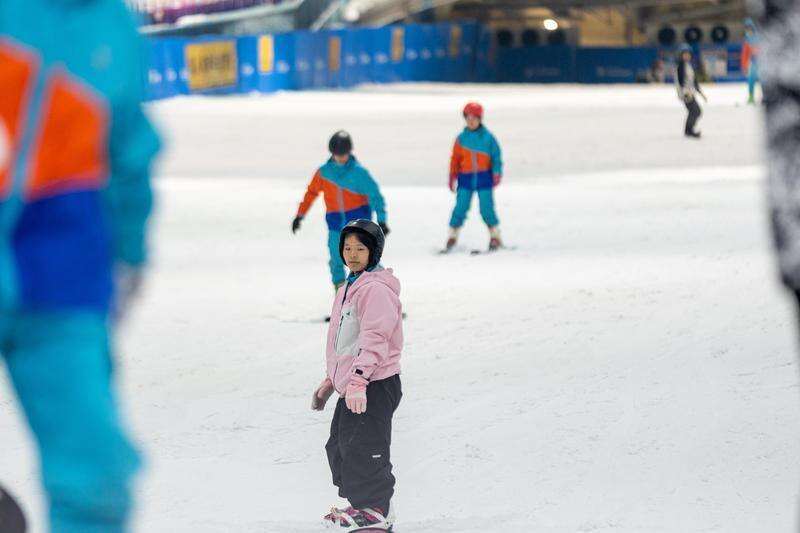 2025年8月6日,浙江省湖州市长兴县太湖龙之梦乐园冰雪世界室内滑雪场,游客们正在滑雪。