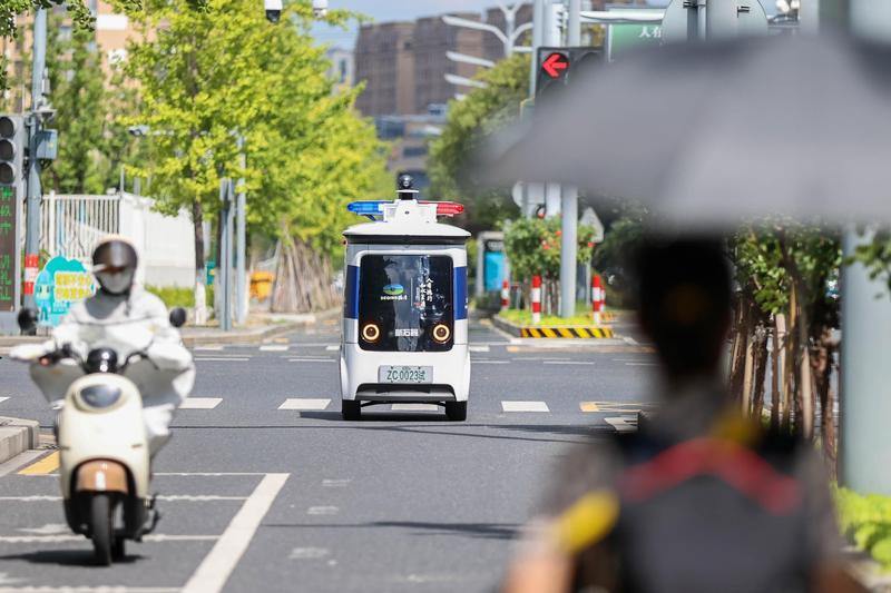 8月6日,湖州市德清县无人驾驶公安巡逻宣防车在武康街道城区巡逻。该车搭载了自动驾驶、音视频和文字宣传系统以及车辆信息与人员信息采集三大系统,设置“一键报警”按钮求助,车厢内方便应急的路障、灭火器、医疗包等,提升应对突发状况的灵活性。