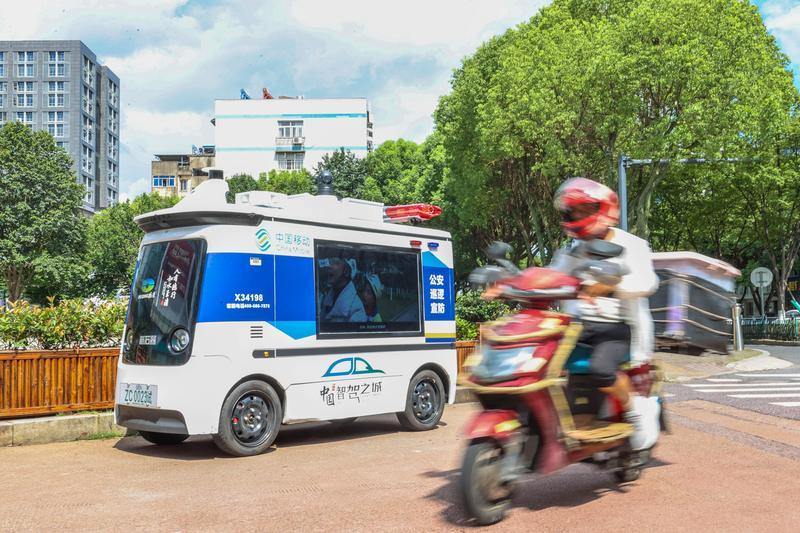 8月6日,湖州市德清县无人驾驶公安巡逻宣防车在武康街道城区巡逻。该车搭载了自动驾驶、音视频和文字宣传系统以及车辆信息与人员信息采集三大系统,设置“一键报警”按钮求助,车厢内方便应急的路障、灭火器、医疗包等,提升应对突发状况的灵活性。