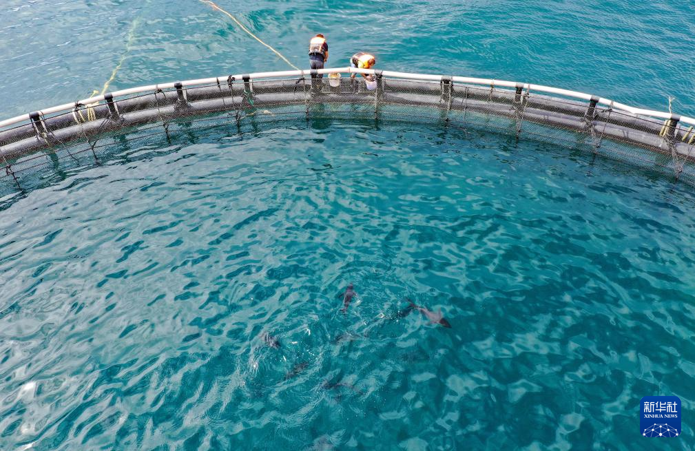 9月17日,陵水黄鳍金枪鱼海上养殖示范基地工作人员在投喂金枪鱼(无人机照片)。