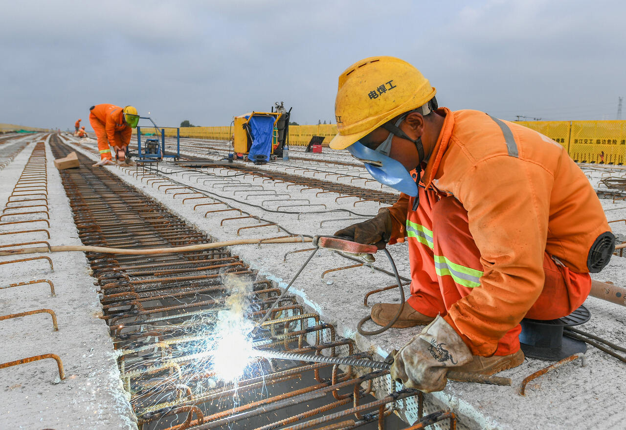 2025年10月1日,在甬金衢上高速公路金华城区段工地上,施工人员在焊接钢筋。