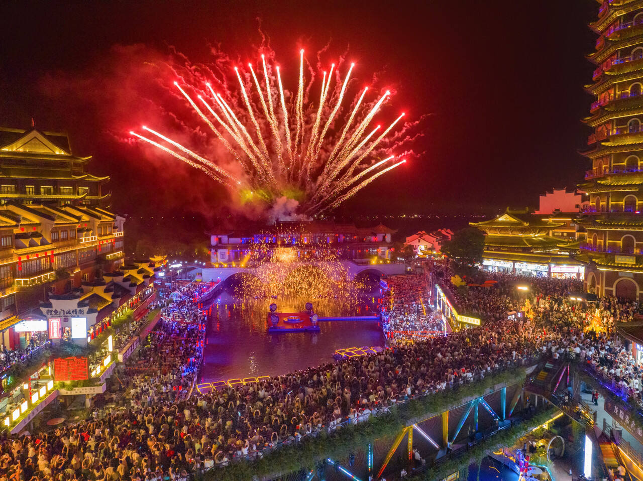 2025年10月1日,浙江省湖州市长兴县太湖龙之梦乐园内灯光璀璨,现场非遗“打铁花”、烟花秀等项目精彩纷呈,吸引众多市民、游客前来游玩观赏,乐享多彩假日。