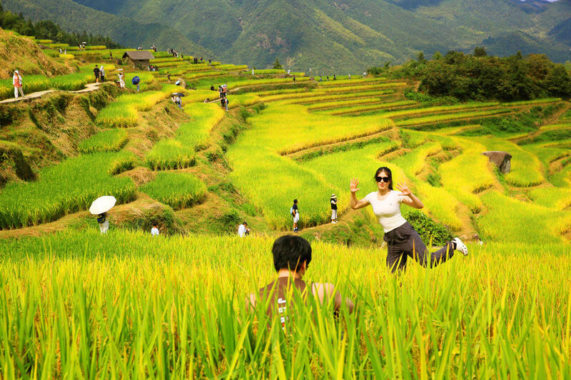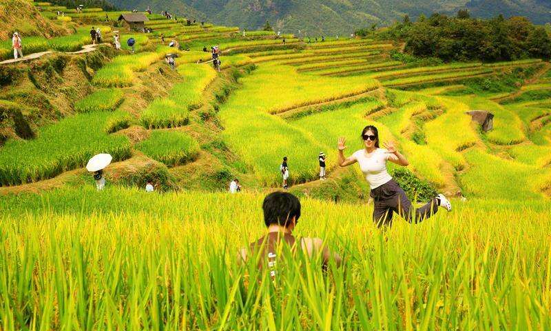 10月2日,国庆长假进入第二天,浙江省丽水云和梯田游客如织。 国庆长假期间正是高山稻谷成熟期,有“中国最美梯田”、“最佳湿地”等美誉的云和梯田稻谷飘香,吸引了全国各地游客。