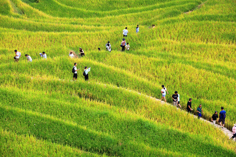 10月2日,国庆长假进入第二天,浙江省丽水云和梯田游客如织。 国庆长假期间正是高山稻谷成熟期,有“中国最美梯田”、“最佳湿地”等美誉的云和梯田稻谷飘香,吸引了全国各地游客。