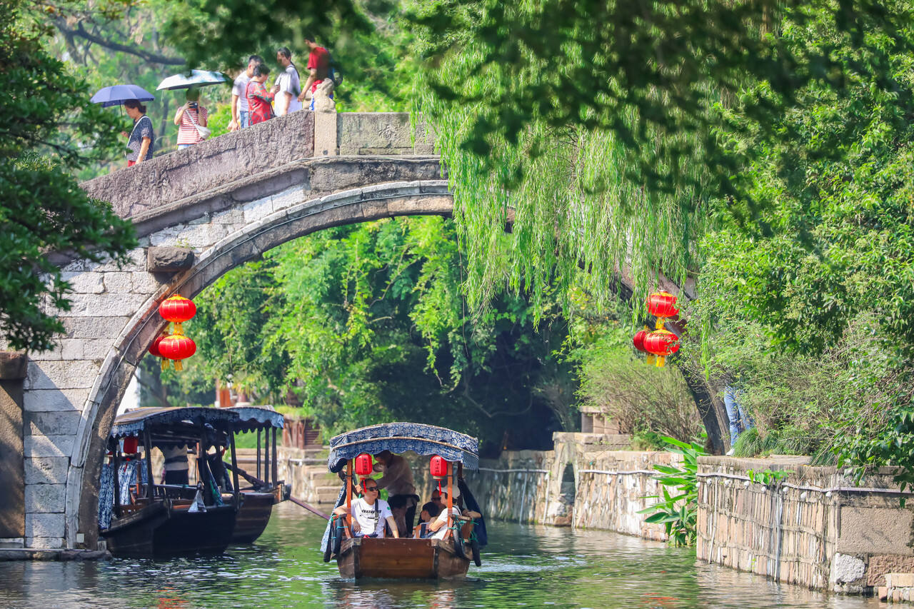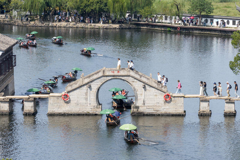 10月2日,游客在绍兴市东湖风景区乘坐乌篷船游玩,感受江南水乡美景。