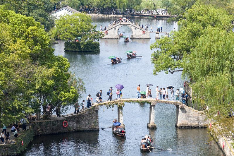 10月2日,游客在绍兴市东湖风景区乘坐乌篷船游玩,感受江南水乡美景。