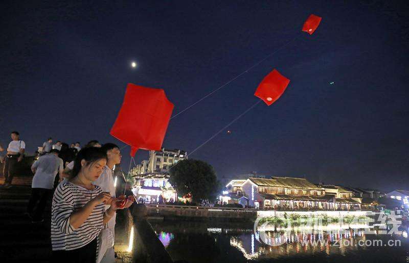 古镇推出“月满运河·梦栖塘栖”祈福之夜活动,游客领取孔明灯“放飞”,点亮运河夜空。