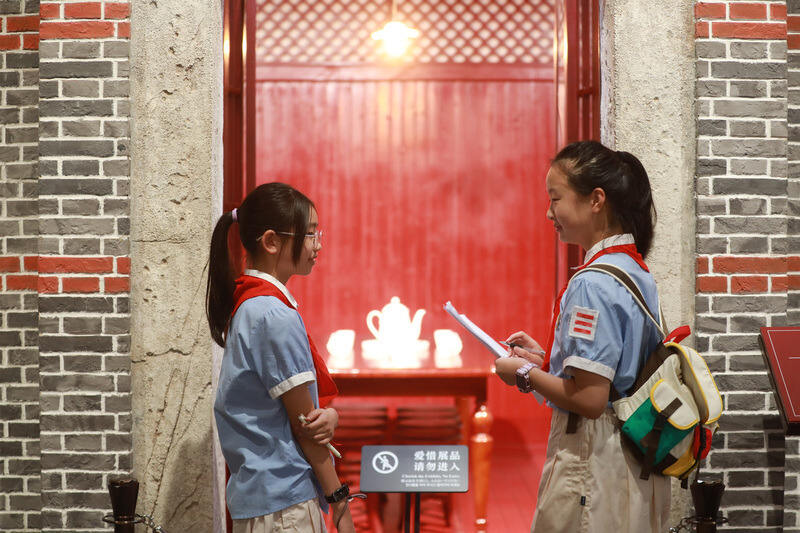 2025年10月7日,小学生在浙江省嘉兴市南湖革命纪念馆参观。
