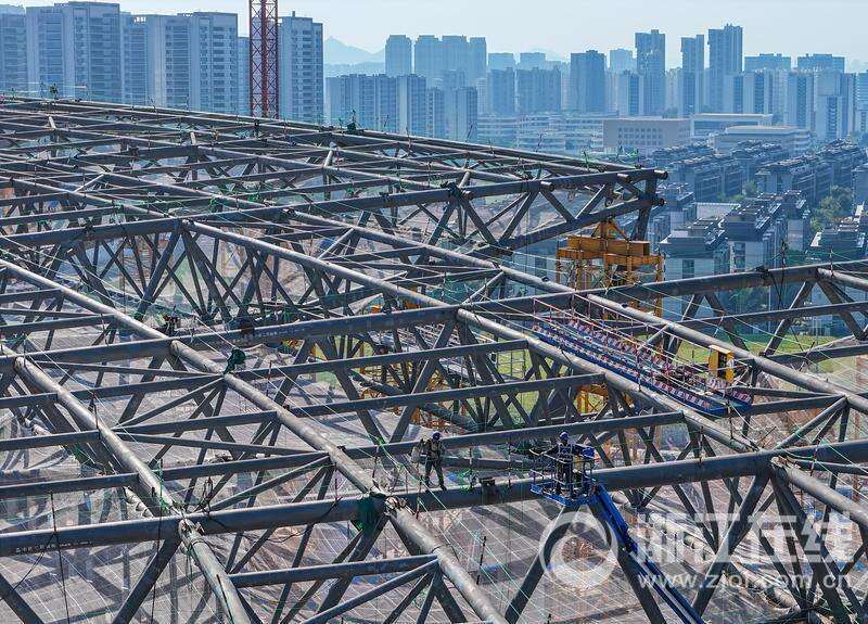 浙江在线10月12日讯(记者 董旭明 摄)10月11日,杭州余杭国际体育中心建设工地,建筑工人在钢屋盖上登高作业。目前一场两馆的主体结构施工已经完成了95%以上,足球场钢结构已经完成50%。 作为浙江省"千项万亿"重大项目,余杭国际体育中心总投资逾95亿元,总建筑面积53.4万平方米,包含专业足球场、综合体育馆和游泳馆。项目建成后,可承办国际级赛事和大型文化活动,同时满足市民健身需求。