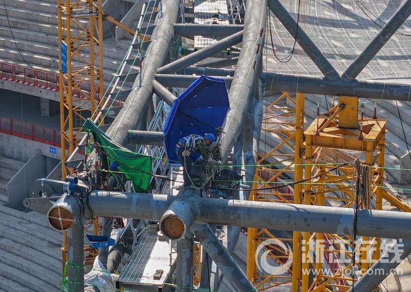 10月11日,杭州余杭国际体育中心建设工地,建筑工人在钢屋盖上登高作业。目前一场两馆的主体结构施工已经完成了95%以上,足球场钢结构已经完成50%。