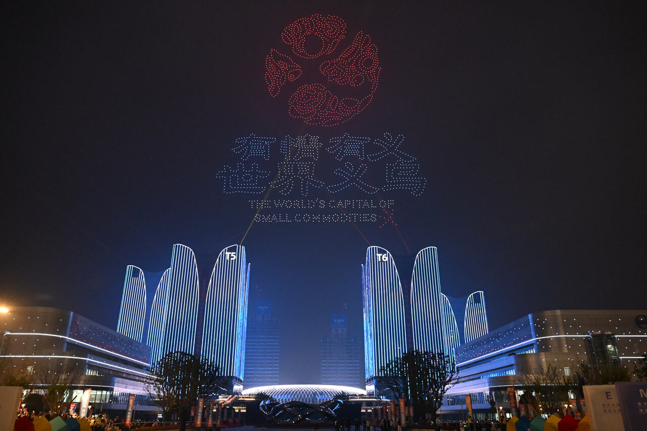 10月14日晚,新开业的义乌第六代市场核心标志性项目——全球数贸中心化身 “光影魔术城”,一场以“数贸星光,见世界答案”为主题的高空无人机灯光表演成了夜色中的最亮风景。