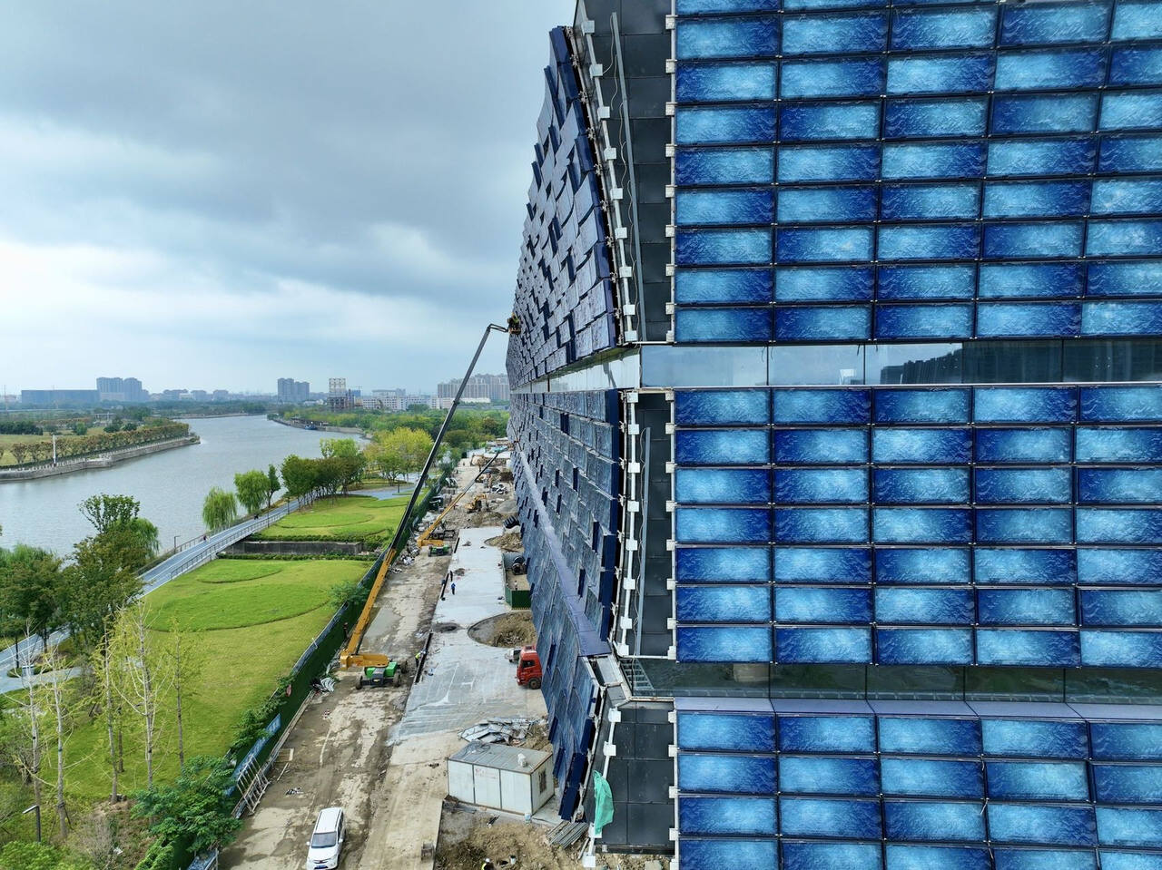 作为传承运河文明的重要载体,该项目总投资近32亿元,总建筑面积达18.6万平方米,涵盖博物馆、国际文化交流中心等核心功能区。750米滨水岸线与独特“舟形”设计相映成趣,普利兹克奖得主团队以运河为灵感打造的“主馆悬浮”景象,搭配国际首次大规模应用的1.78万平方米蓝色琉璃幕墙,将江南韵味与建筑美学深度融合。