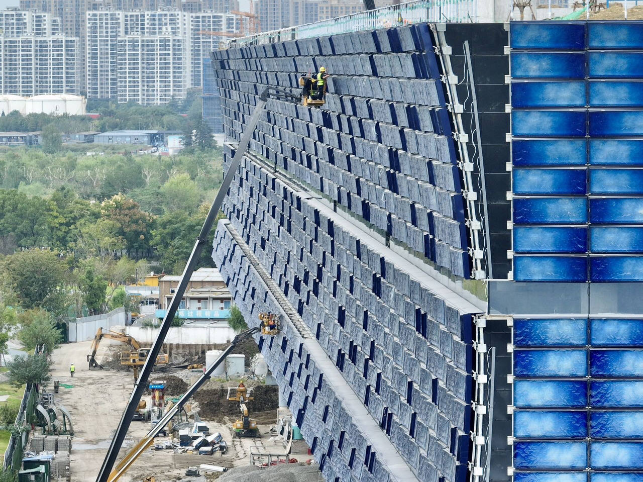 10月16日,杭州拱墅区运河之畔,中国京杭大运河博物院二期工程的施工现场一派繁忙。工人们正专注安装蓝色琉璃复合板幕墙,这座大运河国家文化公园的国家级地标已全面进入装饰装修阶段,预计年底即可整体竣工亮相。