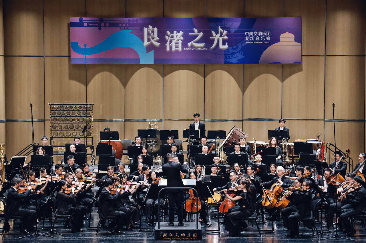 10月18日晚,浙江交响乐团与美国费城交响乐团在杭州运河大剧院联袂献演“良渚之光”专场音乐会,由指挥家胡咏言执棒,呈现中西经典音乐作品。 音乐会由中美两大乐团合作,演绎四部作品:浙江原创交响乐《诗画浙江》、梅森·贝茨作曲的《春江花月夜》(男中音刘涛、女高音余先垚献唱)、吴祖强与刘德海改编的琵琶协奏版《春江花月夜》(琵琶演奏家杨靖独奏),以及贝多芬《第六交响曲》。