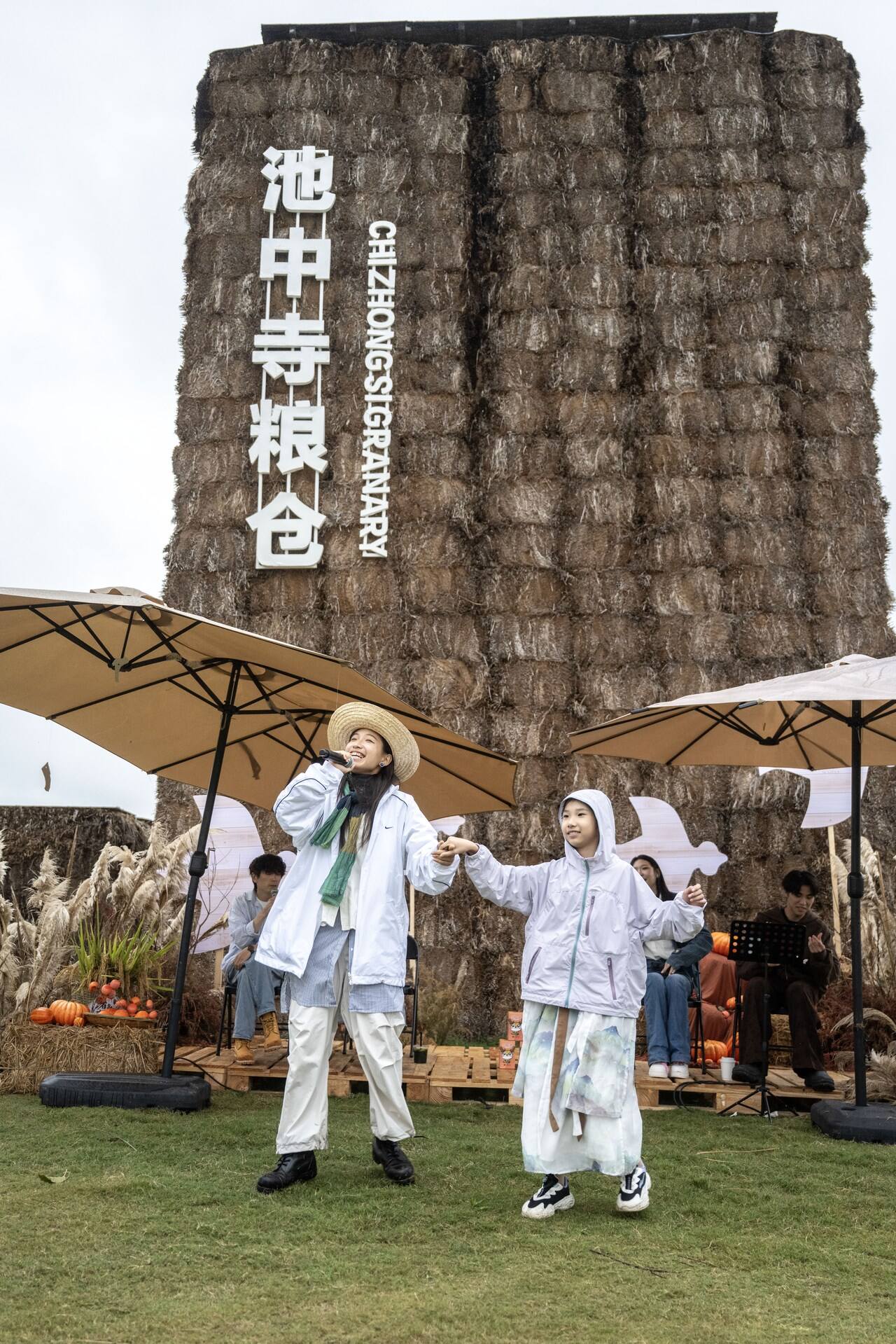 10月18日,细雨中的良渚古城遗址公园池中寺粮仓景区尽显秋意,穿着长袖外套的游客来到这里,在稻田和市集中打卡游玩。