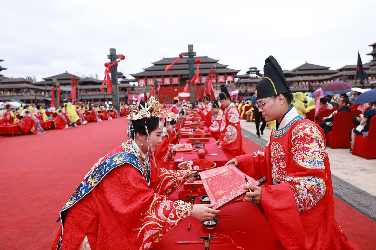 10月18日下午,东阳市首届青年人才集体婚礼在横店影视城秦王宫景区举行,百对青年人才在亲人及来宾见证下,身着中式婚服,体验传统礼仪。