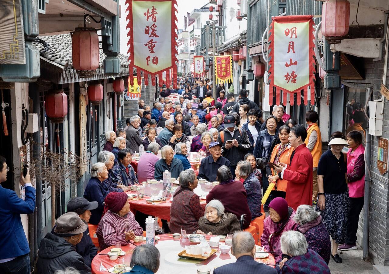 10月26日,平湖市广陈镇,浙沪南北山塘村一起举办“金秋情暖重阳 长街乐宴山塘”长街宴活动,来自两地的300余位老人相聚山塘老街,吃家宴、话家常,共迎重阳佳节。