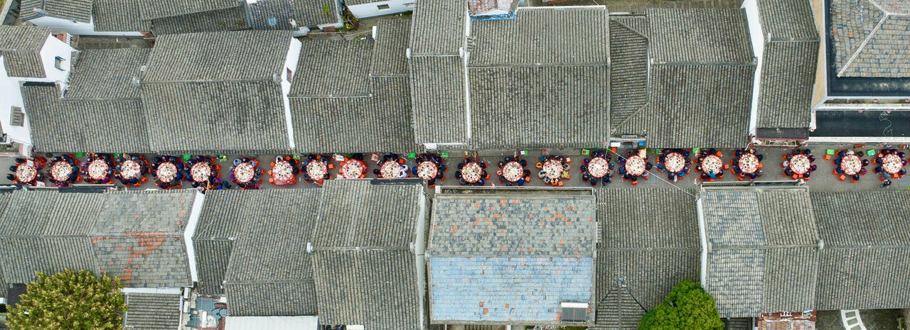 10月26日,平湖市广陈镇,浙沪南北山塘村一起举办“金秋情暖重阳 长街乐宴山塘”长街宴活动,来自两地的300余位老人相聚山塘老街,吃家宴、话家常,共迎重阳佳节。
