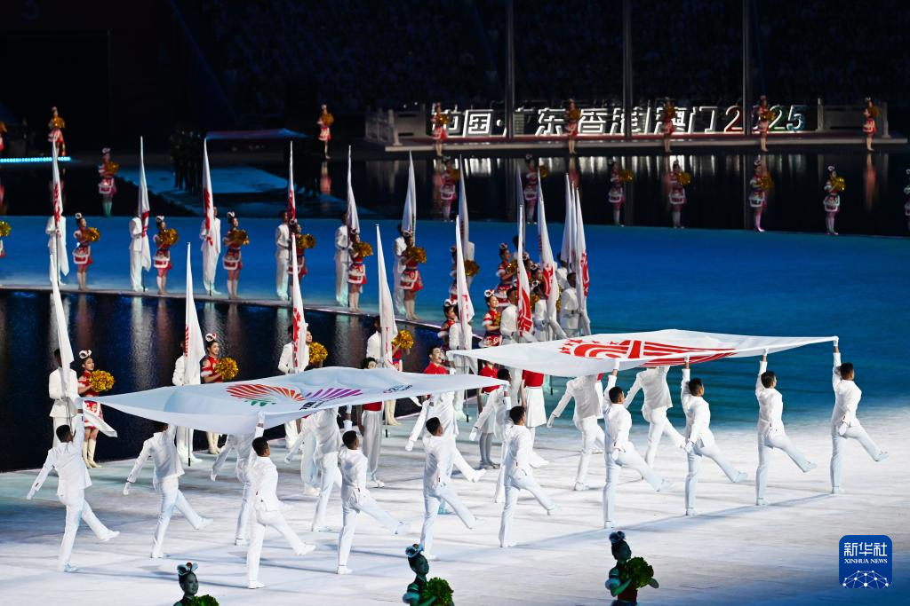 11月9日,旗手护送中华人民共和国运动会会旗和第十五届全国运动会会旗入场。