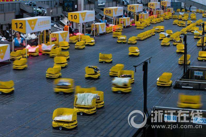 浙江在线11月11日讯(记者 倪雁强 通讯员 白羽 摄)11月10日,“双十一”前夜,湖州市德清县,快鱼华东物流中心迎来一年中最繁忙的时刻。880台橙黄色的机器人分拣员,载着各色服饰包裹,在双层分拣平台上灵巧穿梭。分拣好的货品被放入对应物流袋中,等待发往全国各地。