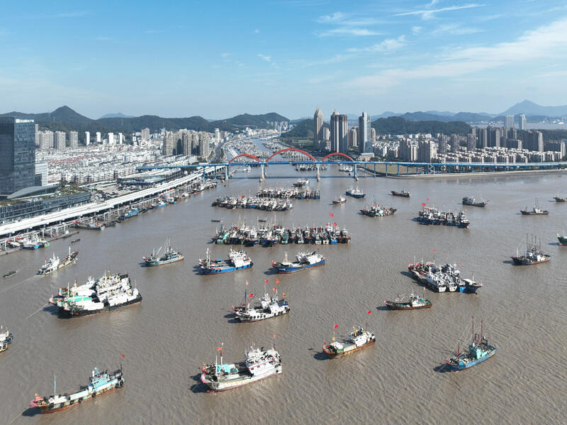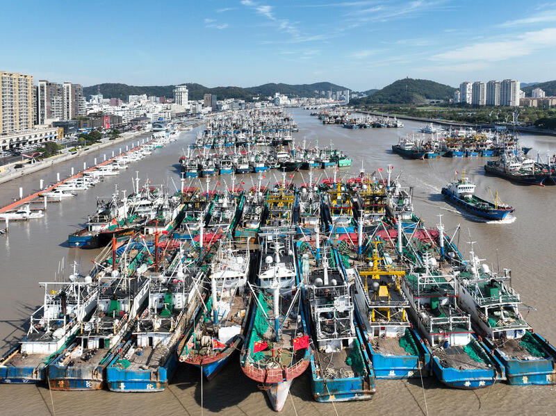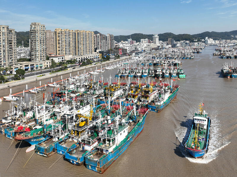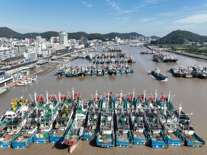 11月18日,受冷空气影响,舟山市普陀区沈家门渔港里停泊着大批躲避寒潮的渔船。