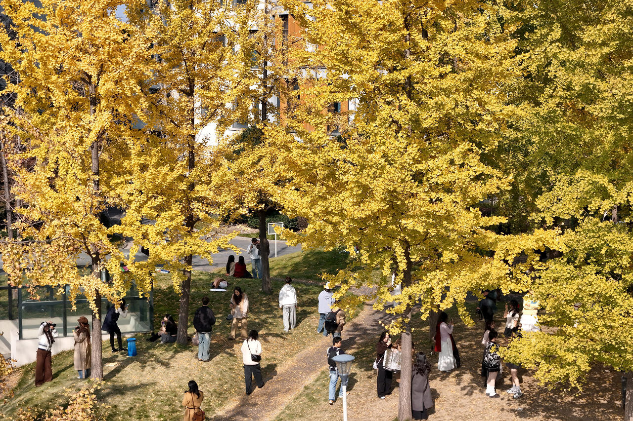 11月22日,杭城在暖意融融中迎来了二十四节气的“小雪”。位于浙江国家大学科技园的银杏林,在冬日暖阳的映照下,呈现一片灿烂的金黄,吸引了众多市民和游客前来打卡拍照。